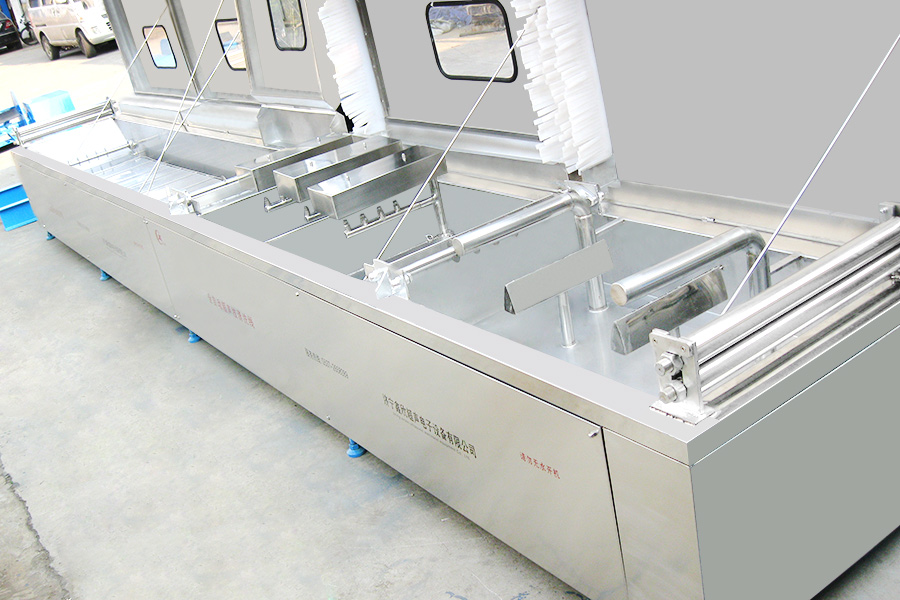 該設備有上下料網帶、超聲波清洗工位、噴淋漂洗工位、高壓風切、熱風烘干工位、溫控水加熱系統、風機、溫控空氣加熱系統、移動式風刀、PLC+觸摸屏控制系統、管路系統及智能電器控制系統等組成。自動進排液和自動加溫系統完全實現了無人干預,自動運行,很大程度上降低了工人的勞動強度。先進的霧氣處理系統可以將清洗時產生的霧氣冷凝回流,空氣經過濾和活性炭吸附后排出。