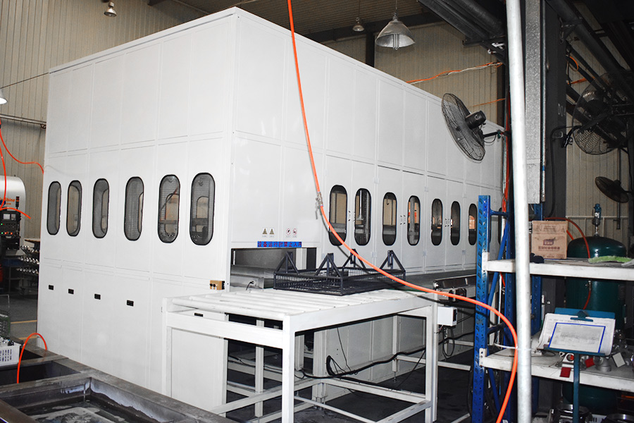 該設備有自動上下料及轉角系統、超聲波清洗系統,自動拋動、自動溢流和油污分離裝置,噴淋系統、自動高壓切水系統、自動烘干系統。機械手自動輸送系統采用高精度直線導軌配合高精度位置檢測傳感器,機械手可以準確的實現工件的抓取和放置。自動進排液和自動加溫系統完全實現了無人干預,自動運行,很大程度上降低了工人的勞動強度。先進的霧氣處理系統可以將清洗時產生的霧氣冷凝回流,空氣經過濾和活性炭吸附后排出。