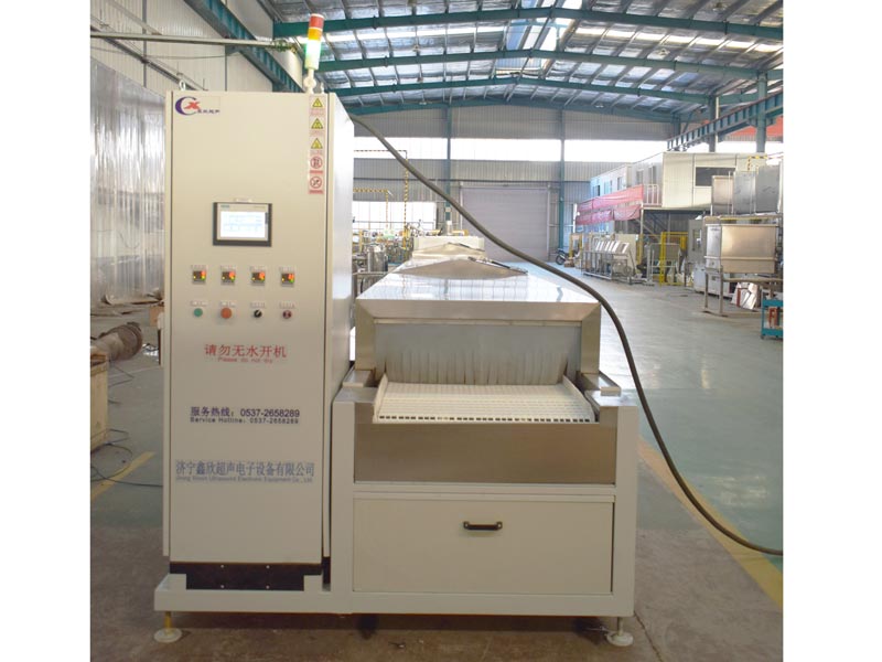 該設備為全自動高潔凈度清洗機,整機為網帶鏈條式傳動機構。采用超聲波清洗、人工高壓補洗、高壓噴淋清洗、慢拉脫水工位、高壓風切、人工補吹、干燥爐、風冷等工藝。該設備共5個工位:上料工位、超聲波清洗工位、人工高壓補洗工位、高壓噴淋清洗工位、慢拉脫水工位、高壓風切工位、人工補吹工位、干燥爐、風冷工位、下料工位。該設備清洗效果好、提高了工件的清潔度。該機結構設計及工藝安排合理、自動化程度高、清洗精度高,有效解決了此類工件的清洗難題。