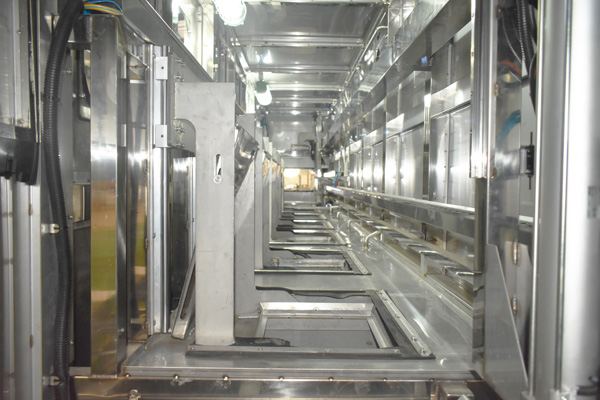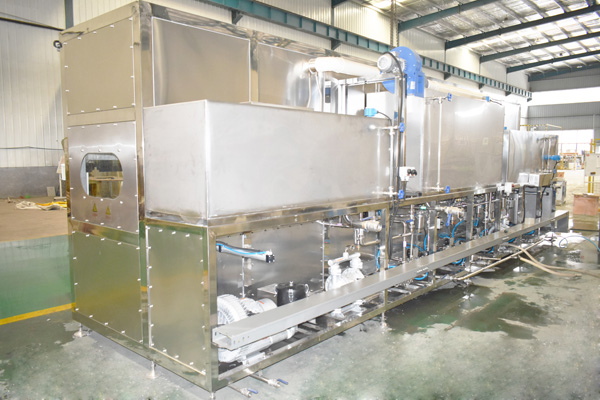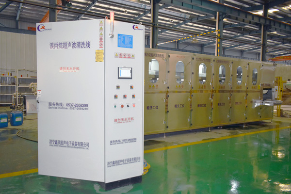 該設(shè)備有上料工位、 超聲波清洗工位× 4、 酒精漂洗工位、 風(fēng)刀切液工位、下料工位、 廢液儲存槽× 2、溶液預(yù)加熱槽× 2、 桁架機(jī)械手、清洗工裝、 拋動系統(tǒng)、 隔爆溫控水浴加熱系統(tǒng)、 PLC+觸摸屏控制系統(tǒng)、 管路系統(tǒng)及智能電器控制系統(tǒng)設(shè)備等組成。該設(shè)備清洗效果好、提高了工件的清潔度。該機(jī)結(jié)構(gòu)設(shè)計及工藝安排合理、自動化程度高、清洗精度高,有效解決了此類工件的清洗難題。