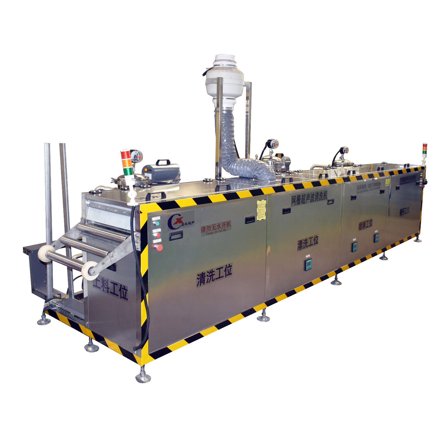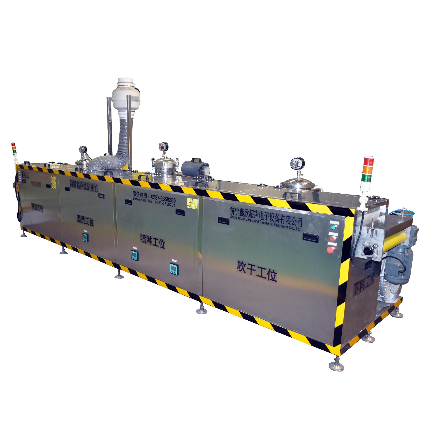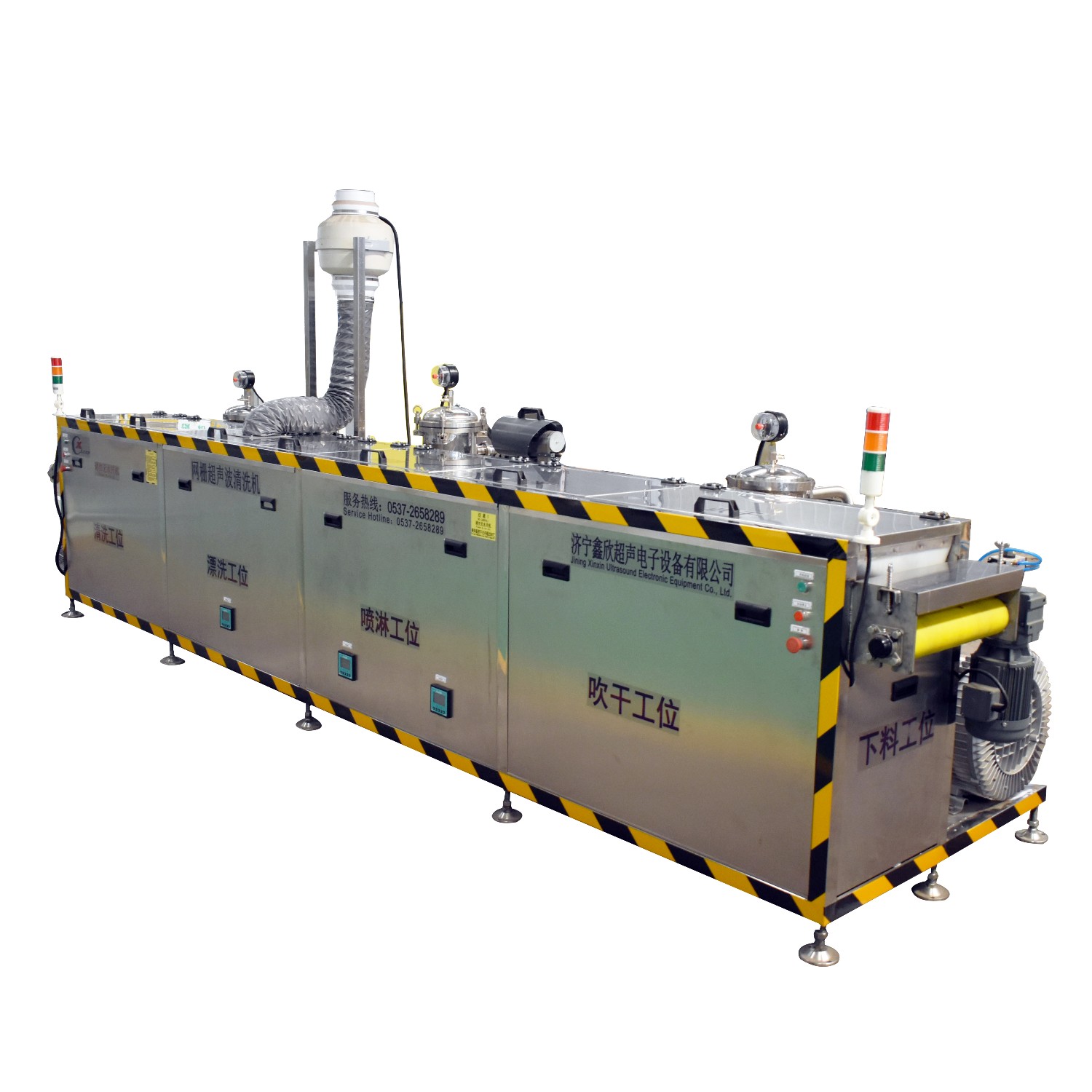 該設備為全自動高潔凈度清洗機,采用2%氫氧化鈉溶液以及純水清洗、超聲波清洗、噴淋清洗工藝。整機為半封閉式結構,主要動力源為動力輸送裝置,PLC自動控制。該設備共有六個工位:與上工序接料對接工位、超聲波清洗工位、噴淋漂洗工位1、噴淋漂洗工位2、高壓風切工位、動力滾筒對接收料工位。該設備清洗效果好,提高了此類工件的潔凈度。該機構設計及工藝安排合理、自動化程度高、清洗精度高,有效的解決了此類工件的清洗難題。
