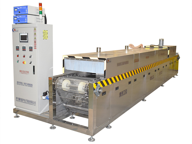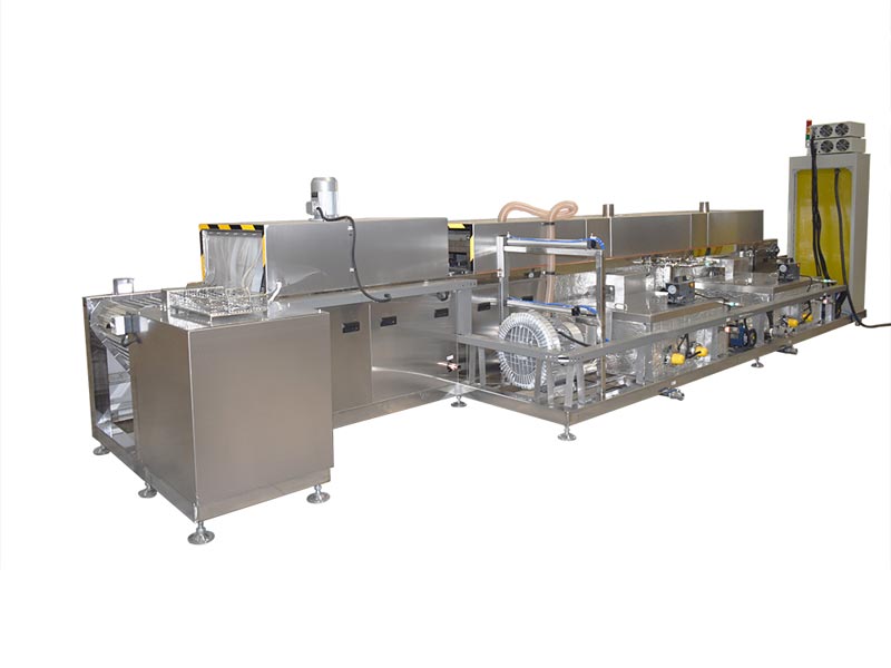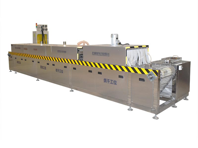 該設(shè)備有上下料網(wǎng)帶、超聲波清洗工位、超聲波漂洗工位、高壓風(fēng)切、熱風(fēng)烘干工位、溫控水加熱系統(tǒng)、風(fēng)機(jī)、溫控空氣加熱系統(tǒng)、移動(dòng)式風(fēng)刀、PLC+觸摸屏控制系統(tǒng)、管路系統(tǒng)及智能電器控制系統(tǒng)等組成。自動(dòng)進(jìn)排液和自動(dòng)加溫系統(tǒng)完全實(shí)現(xiàn)了無(wú)人干預(yù),自動(dòng)運(yùn)行,很大程度上降低了工人的勞動(dòng)強(qiáng)度。先進(jìn)的霧氣處理系統(tǒng)可以將清洗時(shí)產(chǎn)生的霧氣冷凝回流,空氣經(jīng)過(guò)濾和活性炭吸附后排出。